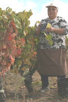 E, videira a videira, geia a geia, as mãos vão cortando os gachos de uvas que se mostram maduras e prontas,