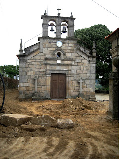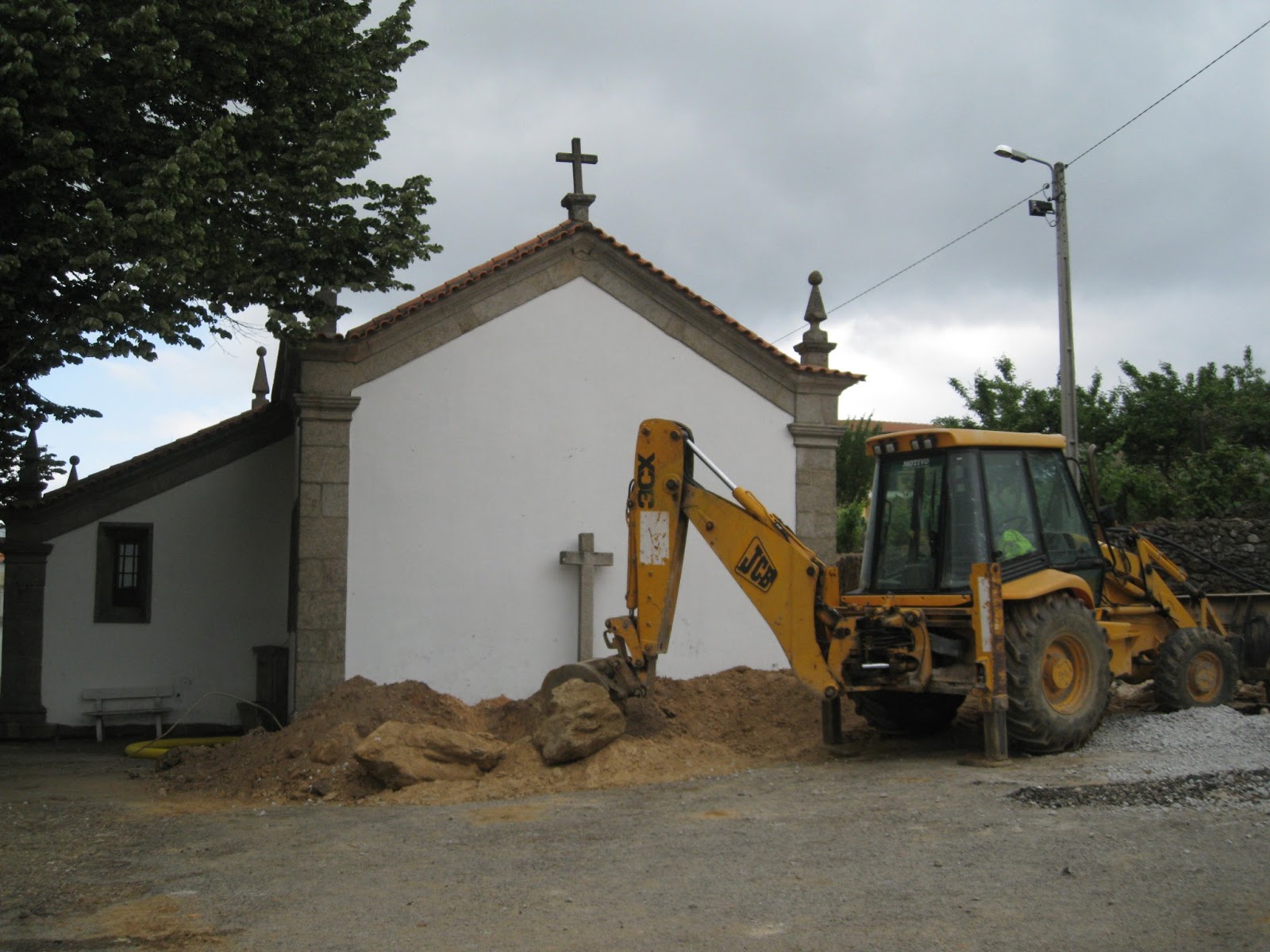 a igreja enquadrada por máquinas e sulcos profundos, pensarão que há petróleo? ou moedas como já aconteceu?