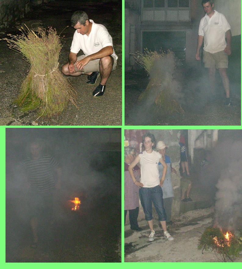 que se juntam para saltar, enfrentando corajosamente o fumo, as chamas e "voando" sobre os odores libertos pelo trovisco e outra ervas. quem não pode saltar, salta ao colo, como é o caso da Ana Rita, mas o importante é passar pelo fumo.