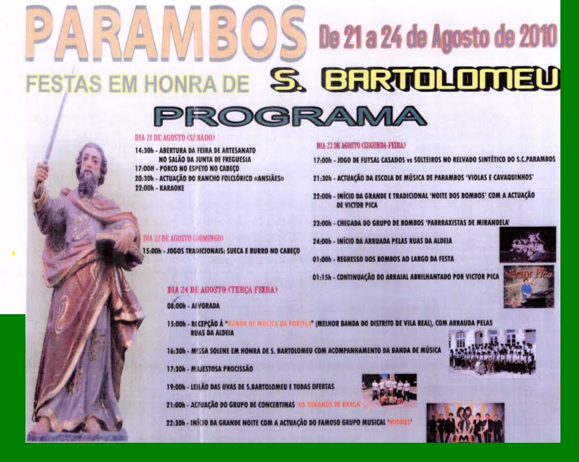 A Comissão de Festas de S. Bartolomeu de Parambos divulgou o cartaz das tradicionais Festas em honra do S. Bartolomeu e para todo o povo da freguesia e "forasteiros" que sempre são Bem-vindos